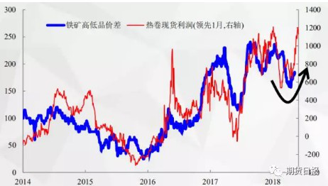 此次高爐盤面利潤(rùn)回落,一方面是因?yàn)?/span>4月初鋼價(jià)反彈鋼廠利潤(rùn)擴(kuò)張,鋼廠對(duì)高品位礦石偏好再次增強(qiáng),從而導(dǎo)致鐵礦石結(jié)構(gòu)化供需狀況得到改善,在前期鋼價(jià)大幅反彈后近期鐵礦石也出現(xiàn)快速補(bǔ)漲,從而鋼礦比出現(xiàn)高位回落。弘則研究董事長(zhǎng)王沛在近期《宏觀月報(bào)》電話會(huì)議中表示,熱卷現(xiàn)貨利潤(rùn)與鐵礦石高低價(jià)差呈現(xiàn)一定的正相關(guān)性(見下圖),且鋼材利潤(rùn)領(lǐng)先鐵礦石高低品位價(jià)差約1個(gè)月的時(shí)間。