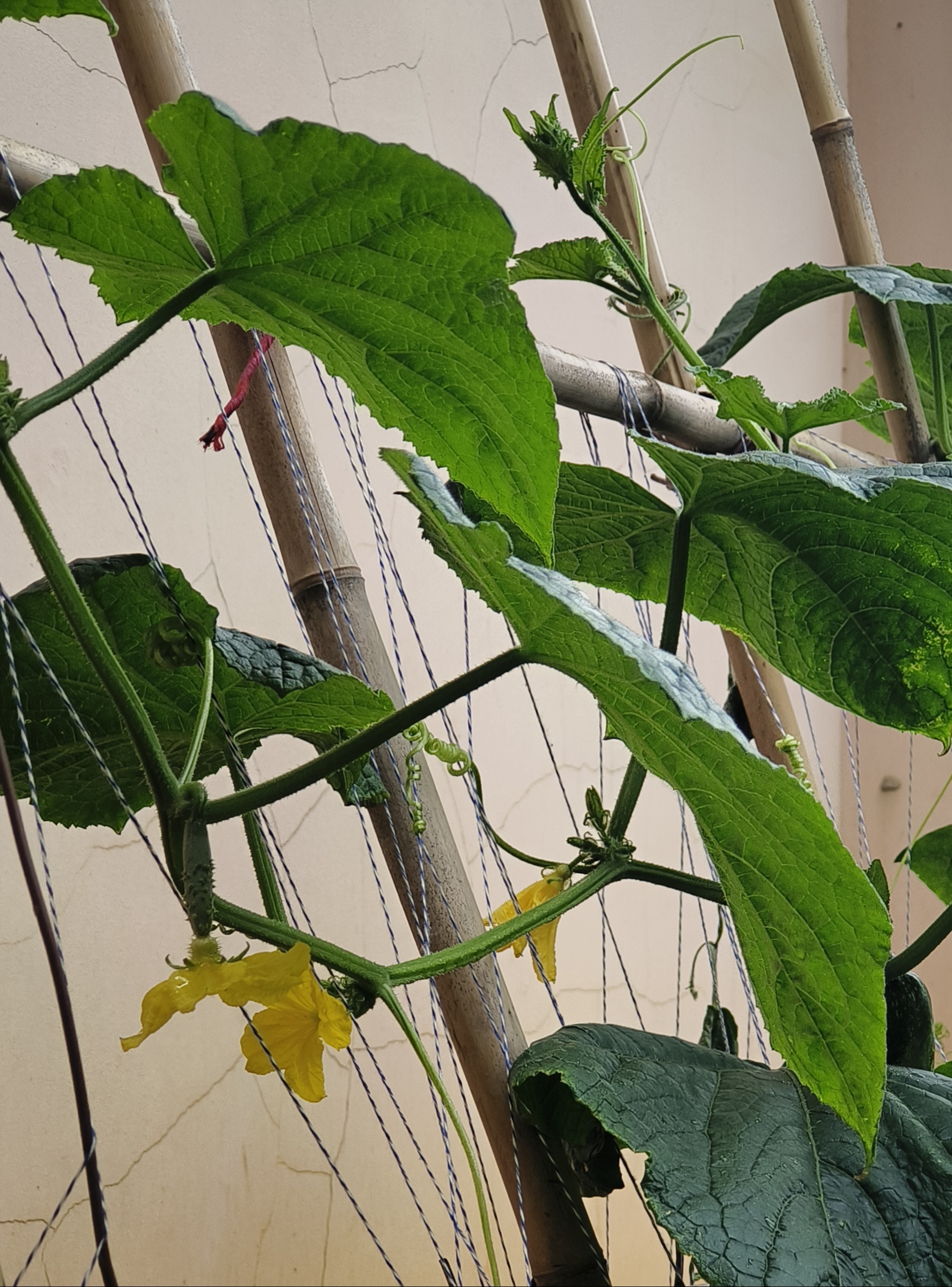 踏入小菜地,最先映入眼簾的是辣椒植株,翠綠葉片間,潔白小花綻著生機(jī),孕育著辣味果實(shí)的希望。一旁茄子苗長(zhǎng)勢(shì)正好,紫綠葉片錯(cuò)落,淺紫小花隱于葉間,仿佛在默默積攢力量,待結(jié)成飽滿茄子。薄荷叢散發(fā)著悠悠清香,葉片帶著細(xì)碎紋路,輕輕觸碰,那股清涼瞬間沁入鼻腔,驅(qū)散工作的煩悶。黃瓜藤順著竹架攀爬,寬大綠葉簇?fù)碇髌G黃花,小巧黃瓜悄悄探出頭,滿是俏皮。